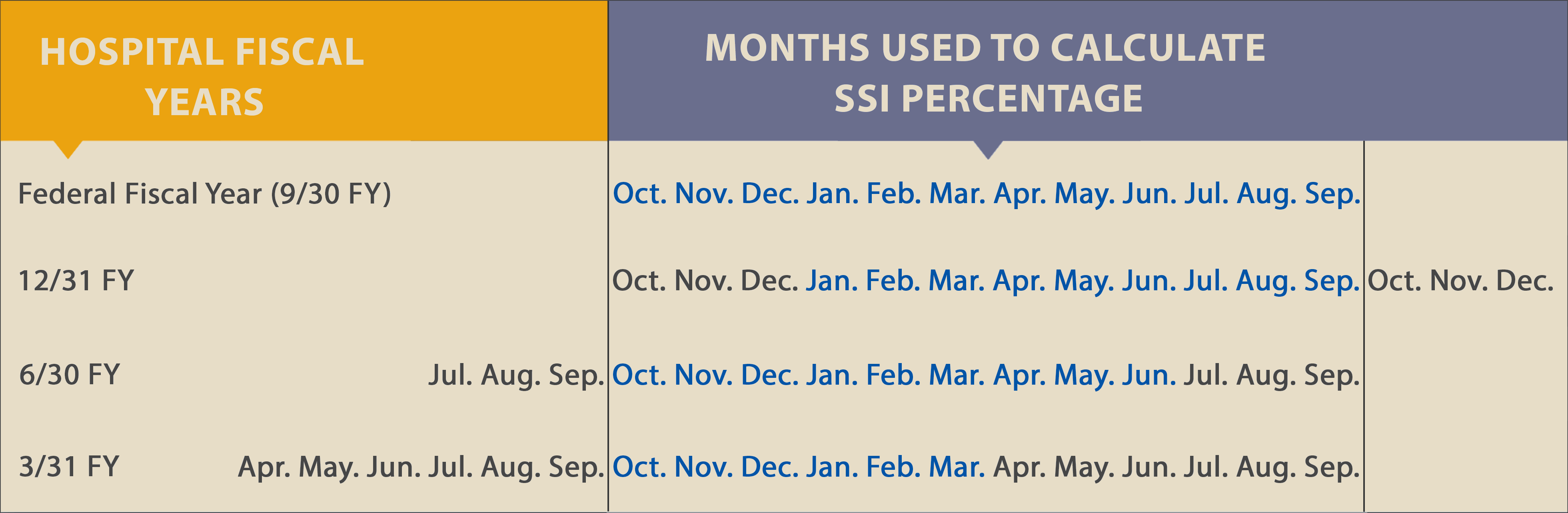 SSI ratios are calculated based on the Federal Fiscal Year (FFY) which runs from 10/1 through 9/30. So, for hospitals with a 9/30 Fiscal Year, the FFY and hospital’s fiscal year are in perfect alignment when CMS publishes SSI ratios for all DSH hospitals. But for 12/31, 3/31, and 6/30 fiscal year hospitals, the CMS report is calculating SSI ratios for the FFY, and not including several months within the hospital’s fiscal year-end cost report.